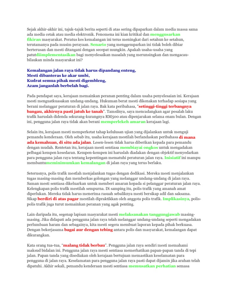Up to 3 cash back Tajuk. Usaha Menangani Kemalangan Jalan Raya Isu nahas atau kemalangan dan kematian di jalan raya sudah menjadi masalah negara yang sering. Penanda wacana yang sesuai hendaklah digunakan untuk memberi gambaran bahawa karangan sudah tiba ke penghujung.